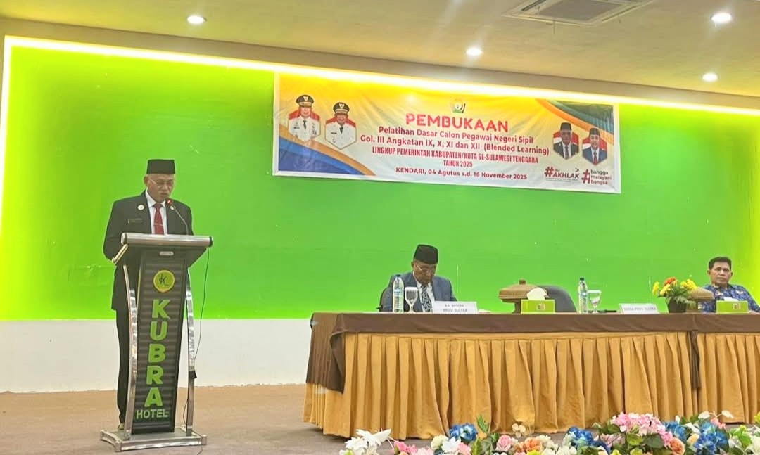 PENASULTRAID, KENDARI – Sekretaris Daerah (Sekda) Provinsi Sulawesi Tenggara (Sultra) H. Asrun Lio secara resmi membuka Pelatihan Dasar (Latsar) Calon Pegawai Negeri Sipil (CPNS) Golongan III Gelombang III Angkatan IX, X, XI, dan XII Tahun 2025 lingkup pemerintah kabupaten/kota se-Sultra di Kota Kendari pada Senin 10 November 2025.