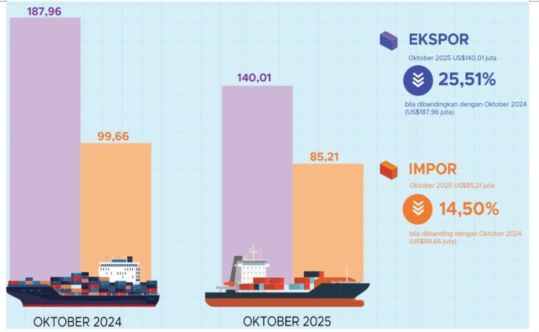 Penurunan ini dipertegas dengan realisasi ekspor pada Oktober 2025, yang hanya mencapai 140,01 juta dollar AS. Angka tersebut turun 25,51 persen jika dibandingkan capaian ekspor pada Oktober tahun sebelumnya.