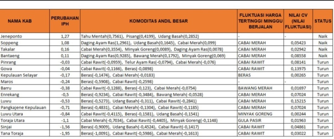 Data yang dirilis Badan Pusat Statistik (BPS) RI dari olahan Sistem Pemantauan Perkembangan Komoditas dan Harga Pangan (SPPKP) Kementerian Perdagangan, tiga kabupaten di Sulsel mengalami kenaikan IPH yang mengindikasikan adanya tekanan harga.