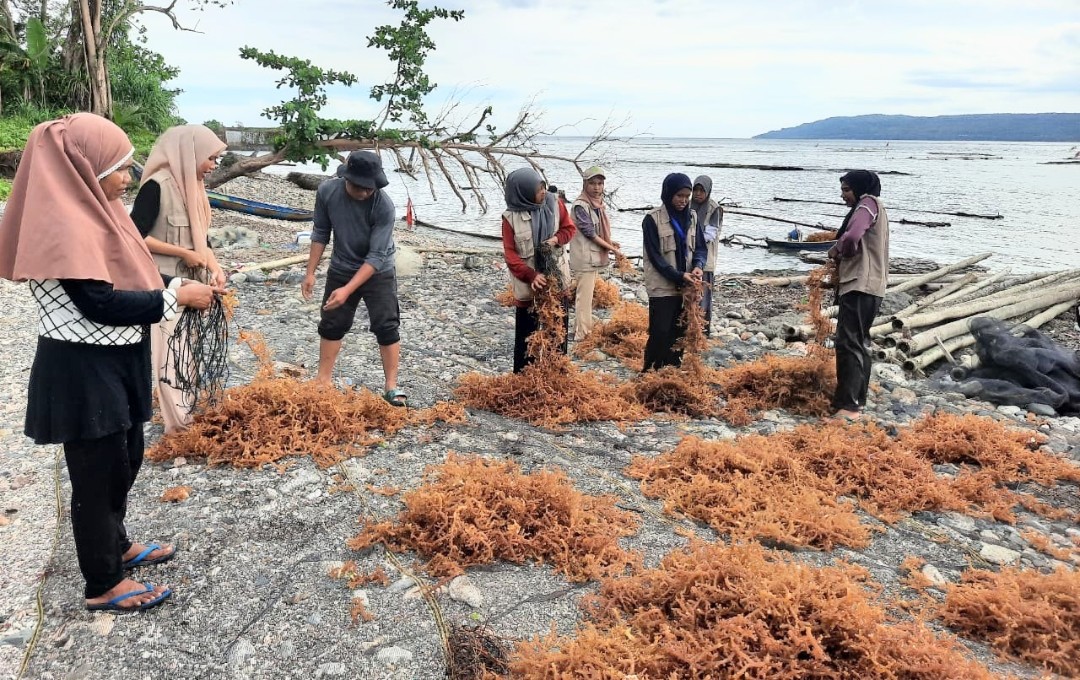 Di tepi pantai, warga terlihat sibuk menarik tali-tali rumput laut dari laut ke darat, menjemur, dan mengikat hasil panen mereka. Di antara warga, tampak pula sekelompok mahasiswa berompi coklat dari Universitas Muhammadiyah Buton (UMB) yang dengan semangat ikut membantu proses panen tersebut.
