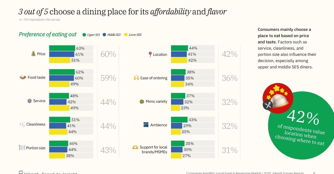 Konsumen umumnya memilih tempat makan berdasarkan harga (60%) dan rasa (59%) saat makan di luar. Faktor-faktor seperti pelayanan (44%), kebersihan (44%), dan porsi makanan (43%) juga memengaruhi keputusan mereka, terutama di kalangan responden kelas atas dan menengah.
